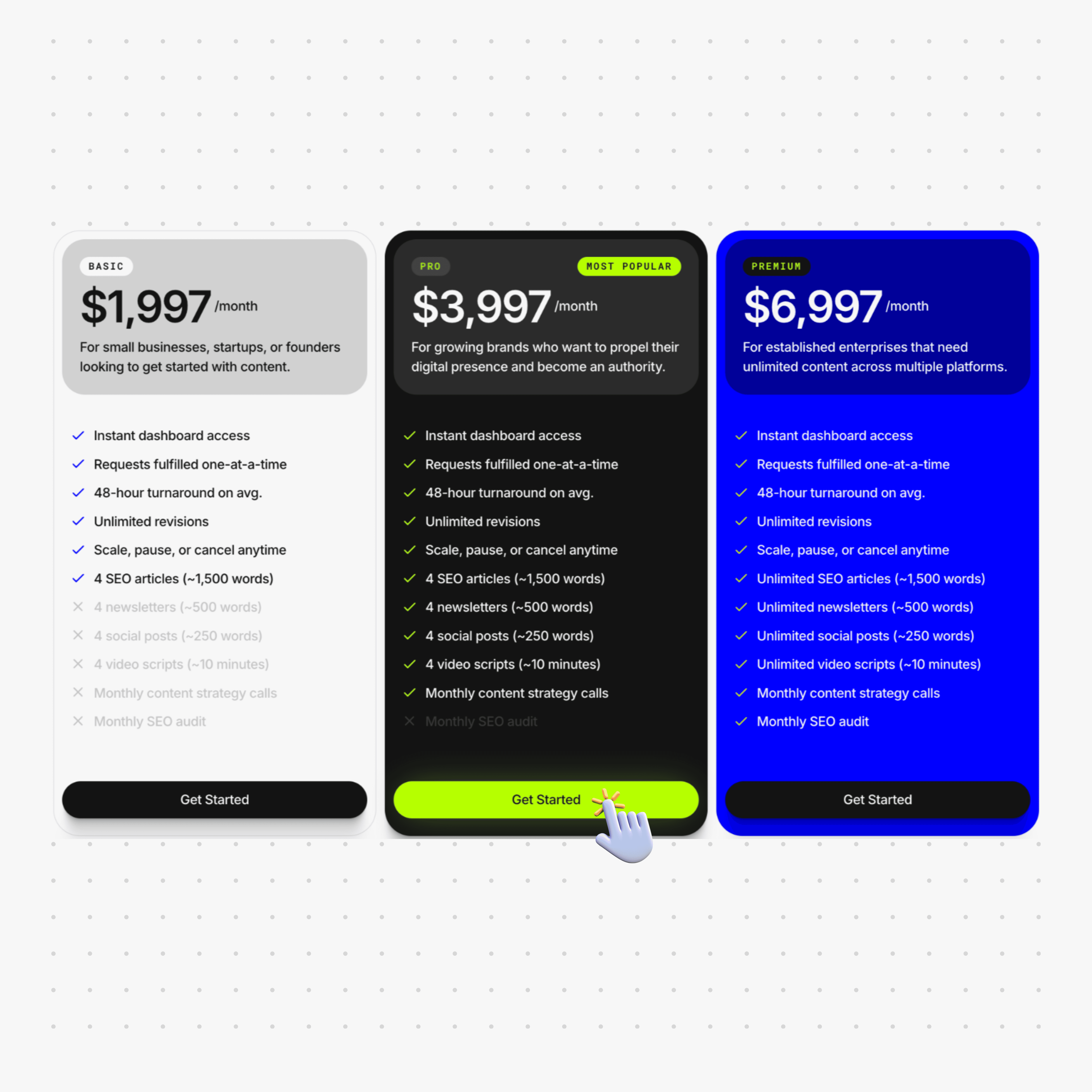 While we don’t provide refunds, our process is designed to guarantee your satisfaction and we take pride in delivery top-quality content. Additionally, we offer unlimited revisions on requests under our monthly subscriptions and one round of edits on our à la carte services to ensure expectations are met.